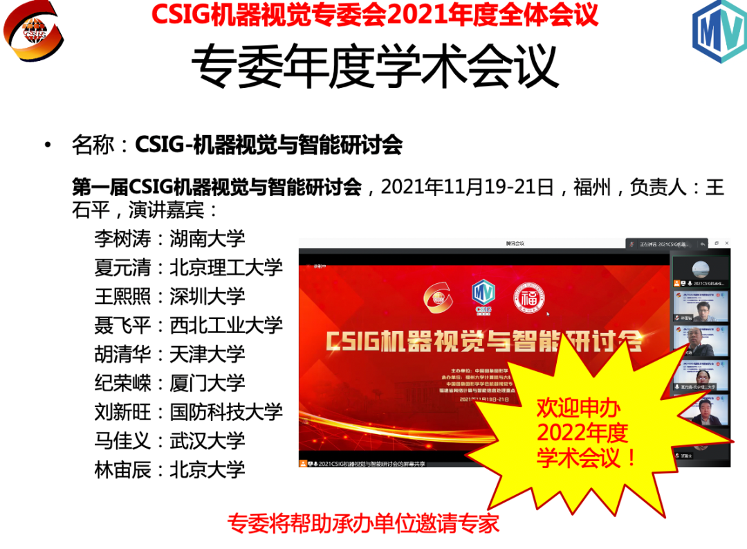 林主任进一步详细介绍了本专委的年度学术会议“CSIG-机器视觉与智能研讨会”,第一届已经成功在福州大学举办,希望委员们积极申办2022年的“CSIG-机器视觉与智能研讨会”。