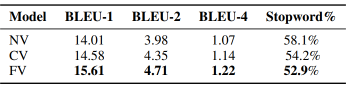 本文使用上述三个模型在 OpenViDial 上进行实验。测评指标有 BLEU、Diversity 和 Stopword%,用于衡量所生成对话的精确性、多样性和丰富性。