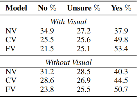 下表是人工测评的结果。给定图片及模型生成的对话,标注者需要评价所生成的回答是否(1)与图片相关,(2)足够具有多样性,(3)可读。人工给出的评价将被归为 No/Unsure/Yes 这三个维度。