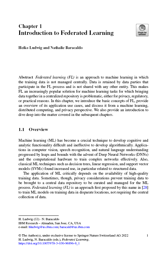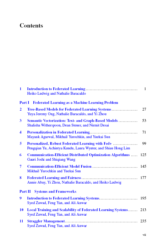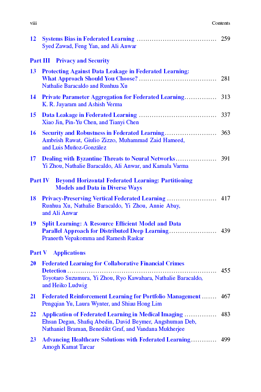 在前言中概述了联邦学习的基础知识之后,在接下来的24章中,读者将深入探讨各种主题。第一部分解决了以联合方式解决不同机器学习任务的算法问题,以及如何高效、大规模和公平地训练。另一部分重点关注如何以一种可针对特定用例定制的方式选择隐私和安全解决方案,而另一部分则考虑运行联邦学习过程的系统的实用主义。本书还介绍了联邦学习的其他重要用例,如分离学习和垂直联邦学习。最后,本书包括了一些章节,重点介绍了FL在真实企业环境中的应用。