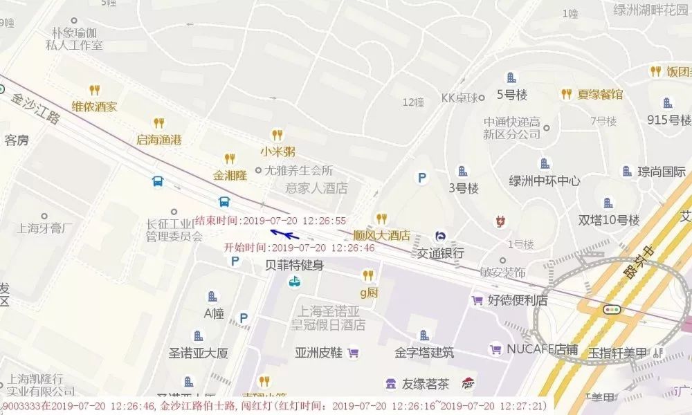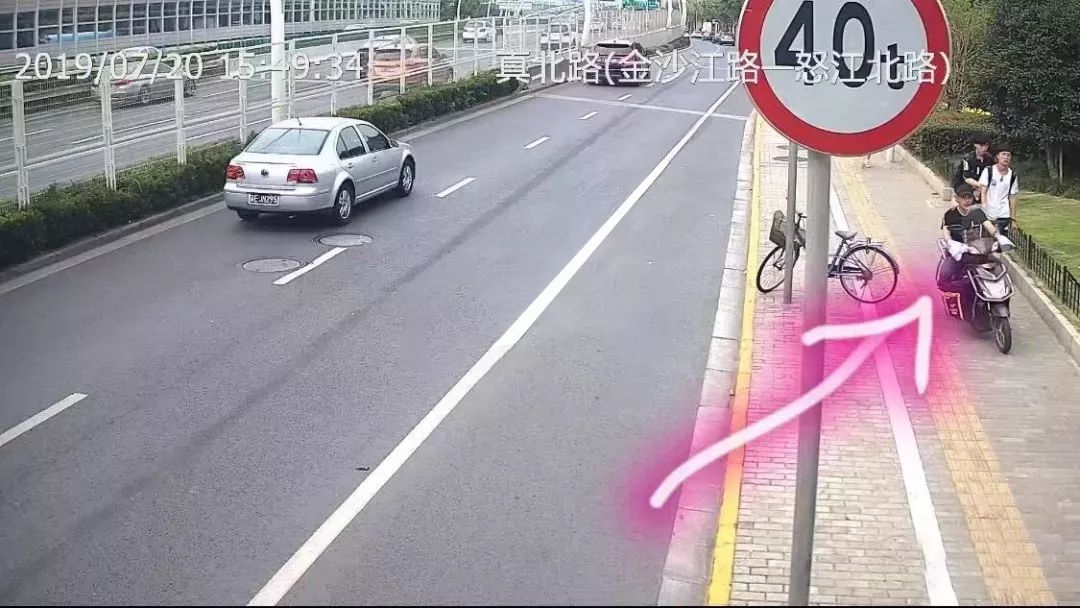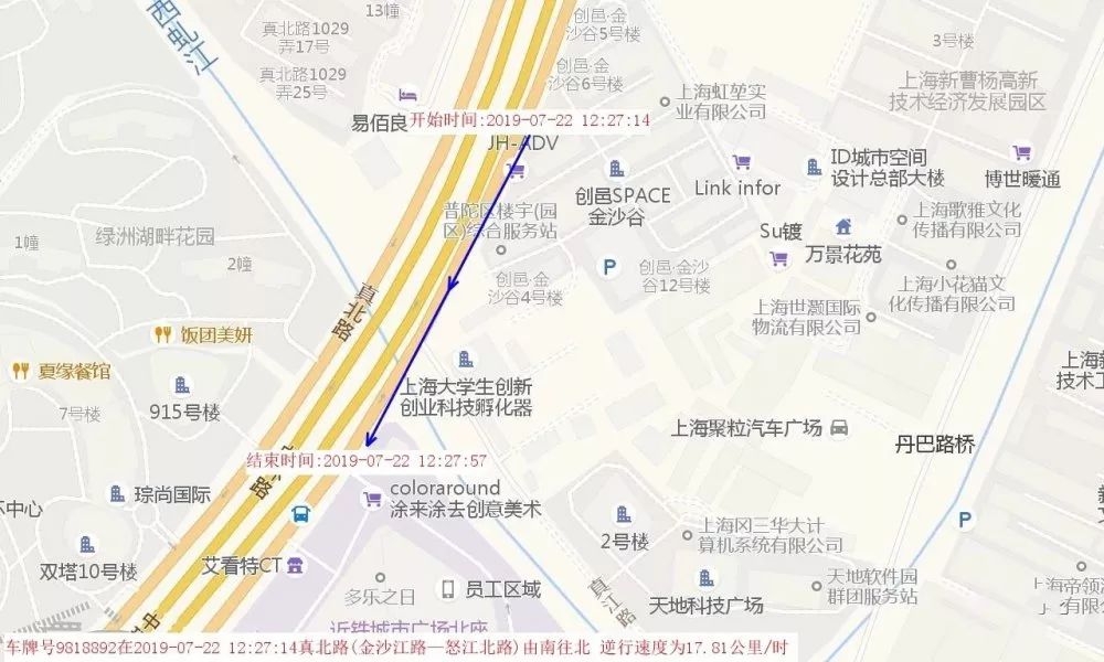 视频:违法当事人闯红灯◆ 违法当事人在真北路靠近金沙江路占用人行道骑行(见图7),RFID电子车牌捕捉到超出规定范围的信号轨迹。![]()
