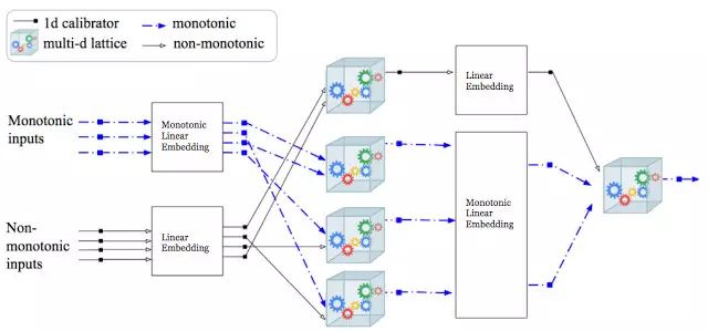 你或许想要用更深的点阵网络进行实验,或者利用部分单调函数(作为深度神经网络或其他TensorFlow架构的一部分)来进行研究。我们提供构件:TensorFlow校准运算符、点阵插入和单调性投影(monotonicity projections)。下图是一个9层深度点阵网络: