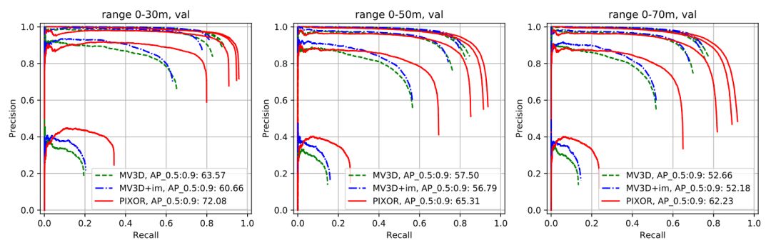 图4:在Kitti Val集上对PIXOR和MV3D进行评价,我们为每种方法绘制了5条精确召回曲线,对应于0.5~0.9之间的5个不同IOU阈值,并汇报平均AP(%),我们在三个不同的范围进行比较。