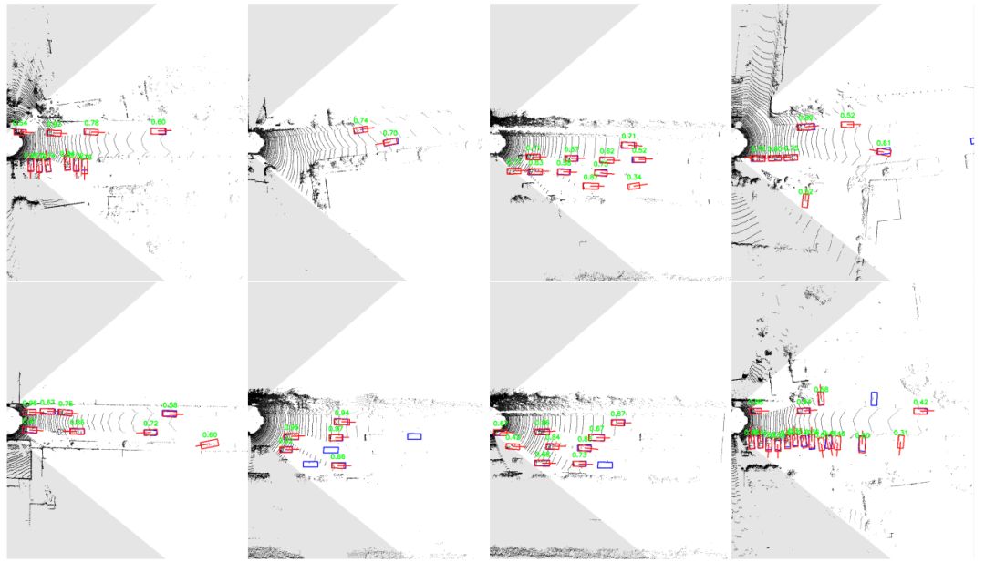 图6:PIXOR在Kitti物体val集上的实例检测结果。检测结果用红色标志,而正确的真实数据用蓝颜色标注。灰色区域超出了相机视野范围所以没有标签。