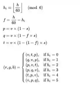 我们以RGB和HSV颜色空间为例,首先来看下HSV和RGB之间的转换公式: