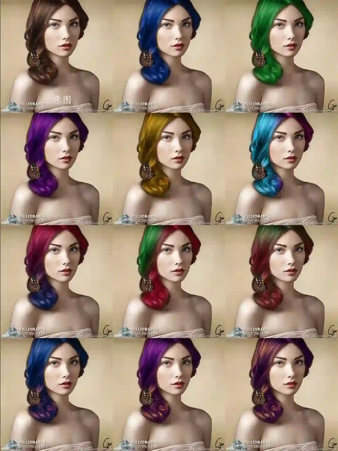 本文效果除了实现正常的单色染发,混合色染发之外,还实现了挑染,如最下方一组效果图所示。