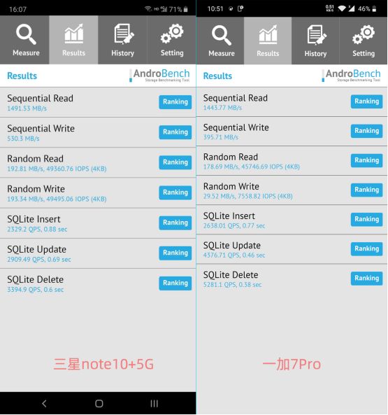 Androbench 测试结果显示,采用 F2FS 文件系统的三星Note 10+ 5G 连续读取 1491.53MB/s,连续写入 530.3MB/s,随机读取 198.81MB/s,随机写入 193.34MB/s。一加7 Pro 连续读取 1443.77MB/s,连续写入 395.71MB/s,随机读取 178.69MB/s,随机写入 29.52MB/s。