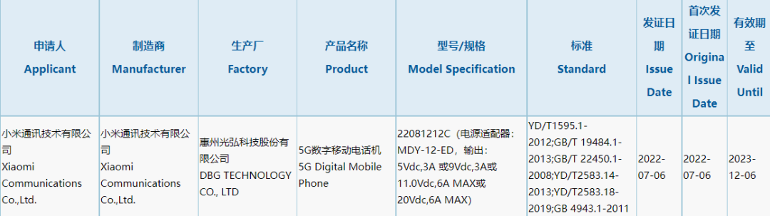 该机型号为 22081212C,配备 120W 充电器——有望支持 120W 有线快充。