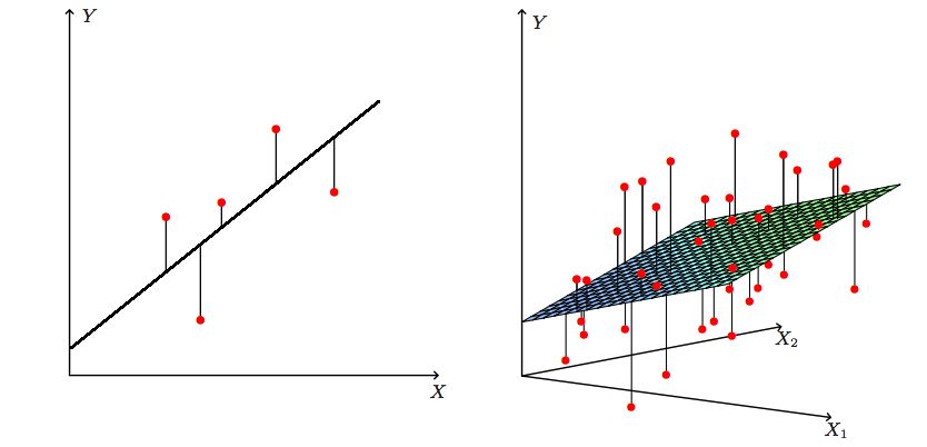 以图形方式考虑这种最小化标准是有帮助的。只有一个预测变量X时,我们处于由预测变量和目标形成的2D空间中。在此设置中,模型在最接近所有数据点的X-Y空间中拟合这样的线:接近度测量为所有数据点的垂直距离的平方和 - 请参见下面的左图。如果有两个预测变量X1和X2,则空间增长到3D,现在模型拟合最接近3D空间中所有点的平面 - 请参见下面的右图。有了两个以上的特征,平面变成了有点抽象的超平面,但这个思想仍然是一样的。这些可视化也有助于了解截距如何为模型提供更大的灵活性:如果包含它,它允许线或平面不跨越空间的原点。