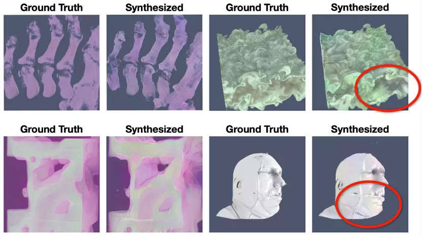 针对上述问题,Levine教授引出了第一项研究工作:面向体渲染的生成模型。Levine教授首先提出了通过生成网络模型对体渲染过程进行建模的技术突破点,详细介绍了如何将体渲染参数和渲染结果之间的映射关系重新封装成可以通过生成网络进行学习和解算的形式。进而展示了一系列该技术生成的高质量渲染结果。同时,Levine教授指出,虽然当前生成的结果存在局部瑕疵,但是相较于传统体渲染,该技术能够实时生成渲染结果,不失为一种有效探索体数据的工具。最后,Levine教授对该技术中对抗网络的设计和对隐空间探索等具体技术细节进行了阐述。