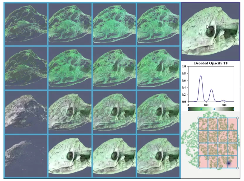 Levine教授报告题目是《Neural Representations for Volume Visualization》(体数据可视化的神经表达)的精彩报告。他首先深入浅出地介绍了体数据可视化涉及的基本概念,包括标量场数据和体数据、体渲染流程及视角、透明度转移函数、颜色转移函数等,指出当前体渲染深度依赖用户交互的研究现状,抛出三个关键问题:如何让用户知道应该调整哪些要素,如何指导用户理解体数据的视图空间,以及能否生成针对体渲染器特征的整体表达?