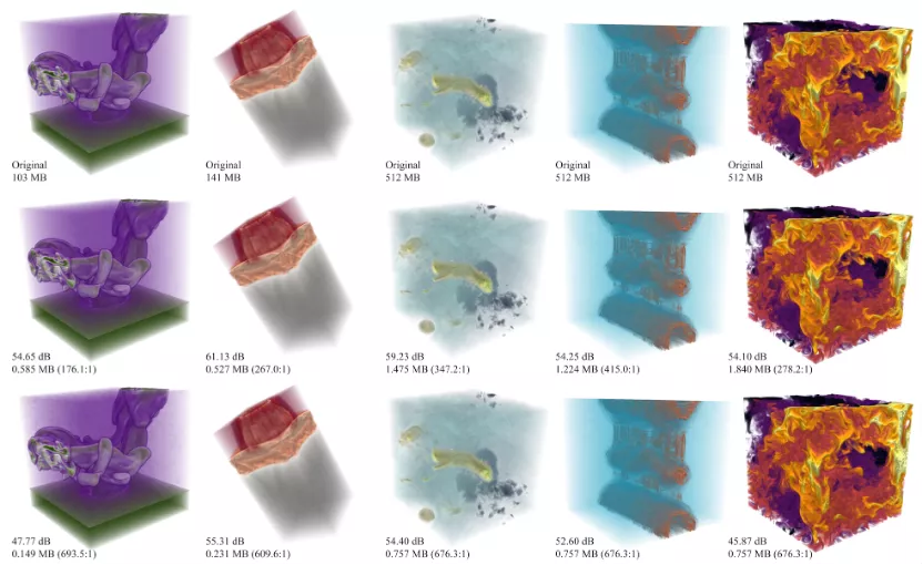 接下来,Levine教授针对当前体渲染面临的另一巨大挑战,即如何处理大规模数据,介绍了第二项工作:面向标量场体数据的压缩神经表达。该方法将标量场体数据表达为可以学习的隐函数,神经网络将数据域中的点映射为输出标量,通过构建权重数量小于原始输入数据体量的神经网络,可以实现压缩函数估算。Levine教授展示了生动的图例,详细介绍压缩和解压的过程以及压缩效果,并通过与先进的TTHRESH技术进行比较,体现了其方法在压缩比和图片质量方面的优势。同时,Levine教授也指出了该方法在训练时间和处理噪声方面的局限性。