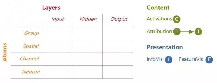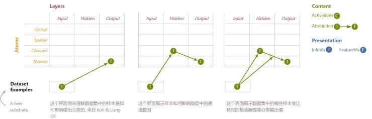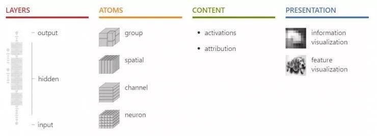 每个元素使用特定的呈现风格(例如,特征可视化或传统信息可视化)来显示特定类型的内容(例如,激活或归因)。该内容存在于由网络给定层如何分解为原子而定义的底层上,并且可以通过一系列操作(例如,将其过滤或将其投影到另一底层上)进行转换。例如,我们的语义词典使用特征可视化来显示隐藏层神经元的激活。