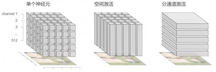 图中用于计算机视觉任务的神经网络的不同的隐含层如何组成了激活值的“立方体”。对立方体的不同分割方法可以把激活值具体到单个神经元、单个空间位置或者单个通道