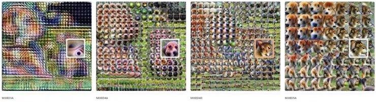去年在在线期刊 Distill 上,谷歌大脑的研究人员再次使用这项技术将单个神经元在网络中是如何工作的进行了可视化,这项工作让我们可以看到在网络中间的各个神经元如何一步步检测到图像中的各个事物,并且让我们看到随着网络层次的加深图像如何越来越复杂。雷锋网曾经在下面这篇文章中详细介绍过