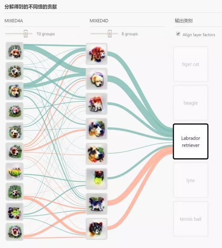 作为一种改进,我们将归因视为另一个用户界面的构建块(building block),并将其应用于神经网络的隐藏层。这样做了之后,我们同时也改变了我们的问题,我们不再问特定像素的颜色是否对「拉布拉多猎犬」的分类很重要,而是问在这个像素位置检测到的高级别想法(例如「松软的耳朵」)是否重要。这种方法与类激活映射(CAM)方法类似,但由于它们将结果解释回输入图像,因此它们错过了以网络隐藏层的丰富行为进行交互的机会。