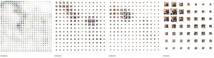 另外,通过跨层(例如「mixed3a」,「mixed4d」)的工作,我们还可以观察到网络对输入的理解是如何发展的:从检测早期图层中的边缘,到后期更复杂的形状以及物体的部分。