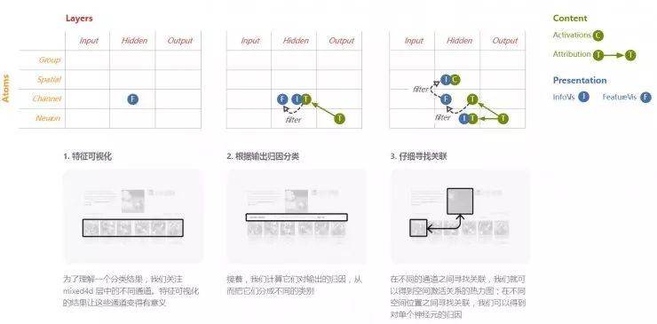这篇文章的研究基于的模型是谷歌 GoogLeNet,选用它展现作者们的界面构建想法的原因是因为其中的神经元有强于一般网络的语义性。虽然这篇文章中作者们采用的是精心选择的任务和网络结构,其中的基础抽象手段和组合它们的方式还是可以用在其它领域的神经网络中。