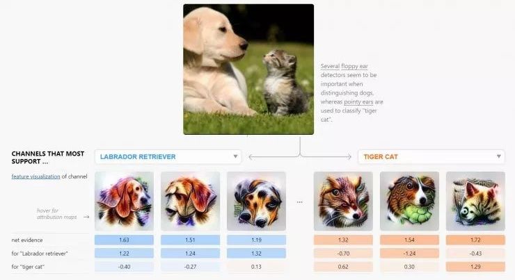 在这篇文章中,作者们把现有的各种可解释性方法看作基础的、可以相互组合的基础结构,在它们基础之上构建丰富的用户界面。他们发现这些互相独立的技巧也能够以统一的形式组合起来,在最后得到的界面中发挥补充性作用。更重要的是,这种统一的形式可以让我们系统地探索可解释性界面的整个空间,让我们得以评估它们是否达到了特定目标。下文中将展示各种样式的界面,从中展示网络检测发现了什么,并且解释网络对物体的理解是如何逐步生成的,同时还把其中涉及到的信息保持在适合人类理解的尺度下。比如,我们将会看到一个看到了拉布拉多犬的网络是如何检测它软塌塌的耳朵的,以及这种检测行为是如何影响网络的分类结果的。