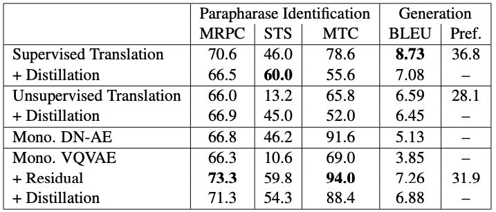 在研究中,Roy和Grangier将他们的模型表现与其他基于MT的方法在复述识别、生成和训练增强方面的表现进行了比较。