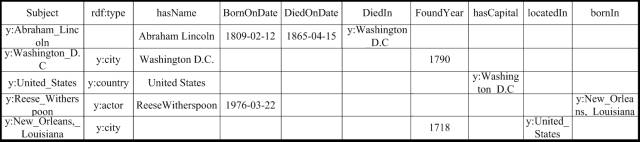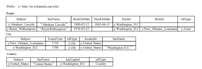 下图1展示了一个人物类百科的 RDF 三元组的知识图谱数据集。例如 y:Abraham_Lincoln 表示一个实体 URI(其中y表示前缀http://en.wikipedia.org/wiki/),其有 3 三个属性(hasName,BornOndate,DiedOnDate)和一个关系(DiedIn)。