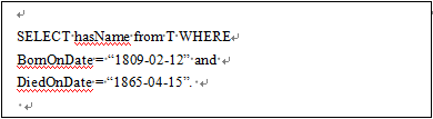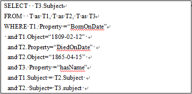 面向 RDF 数据集,W3C 提出了一种结构化查询语言 SPARQL;它类似于面向关系数据库的查询语言 SQL。和 SQL 一样,SPARQL 也是一种描述性的结构化查询语言,即用户只需要按照SPARQL定义的语法规则去描述其想查询的信息即可,不需要明确指定如何进行查询的计算机的实现步骤。2008 年 1 月, SPARQL 成为 W3C 的正式标准。SPARQL 中的 WHERE 子句定义了查询条件,其也是由三元组来表示。我们不过多的介绍语法细节,有兴趣的读者可以参考 [1]。下面的例子解释了 SPARQL 语言。假设我们需要在上面的 RDF 数据中查询“在 1809 年 2 月 12 日出生,并且在 1865 年 4 月 15 日逝世的人的姓名?” 这个查询可以表示成如图 2 的 SPARQL 语句。