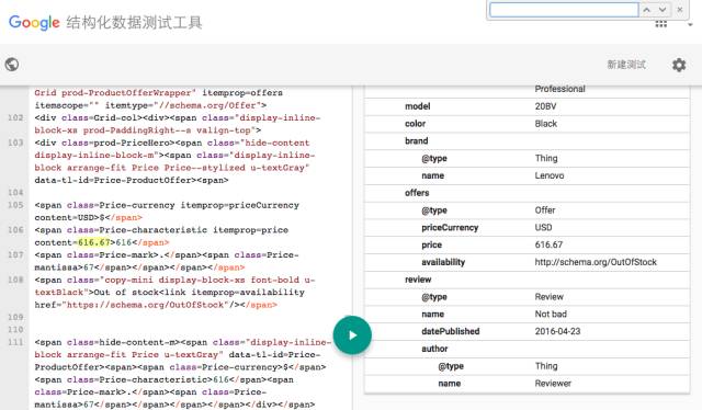 下面介绍Google另外一个利用知识图谱的项目叫“Google Rich Snippets”(Google富摘要)。搜索引擎在搜索结果的页面中会为每一篇搜索结果提供一个目标网页的摘要,以便用户判断是否是自己想搜索的页面。通常网页的摘要是采用“抽取式”方式生成的,即从网页的页面文本中找到和搜索关键词相关的并且比较重要的句子来构成页面的摘要返回给用户。但是Google的富摘要产品中,会抽取在用户HTML页面中以结构化形式存在的知识图谱数据,例如描述实体的属性的数据。目前这方面的标准有包括RDFa, Microdata和Schema.org等结构化数据标签。假设用户想在搜索“Thinkpad T450”产品,在Google返回的Walmart(沃尔玛)线上商店的页面摘要(如图7所示)中,摘要中包含了这个产品的打分(Rating 3星),评论数目(Vote 1份评论)和商品的价格(616.67 美金)。实际上这些重要的数据,用户已经通过Schema.org等结构化的语义标签在HTML中标示出来了,搜索引擎可以通过解析器(Parser)解析出这些结构化数据,利用这些结构化知识图谱数据来产生摘要。我们在图6中展示了利用Google的结构化测试工具,可以从上述沃尔玛产品页面的HTML中抽取上面提到的商品的价格和商标等属性信息。