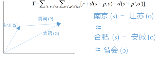 近几年来,机器学习领域也掀起了对知识图谱的研究,热门的课题包括面向知识图谱的“表示学习”,其中最为代表性的研究工作是TransE模型[26]。给定一个知识图谱,我们将知识图谱三元组中的每个主语、宾语和谓词都映射成一个高维向量,其优化目标可以表示为最小化图17中的公式。这个公式的基本含义是,对于存在于知识图谱G里面的任何一条三元组,其中主语,谓词和宾语的向量表示结果为s, p 和o, 我们要求主语(s)和谓词(p)的向量和(SUM)离宾语(o)的向量表示尽量的近;对于不存在知识图谱G中的三元组,则相互距离尽量的远。图17可视化了TransE模型的含义,基本含义是谓词相同的两个三元组,它们分别的主语与宾语的向量差是近似的。在TransE模型的基础上,学术界提出了很多改进的知识图谱Embedding的方案。这些模型在很多任务,例如知识图谱的谓词预测,知识补全等方面比以前的方法在准确度都有不小的提升。