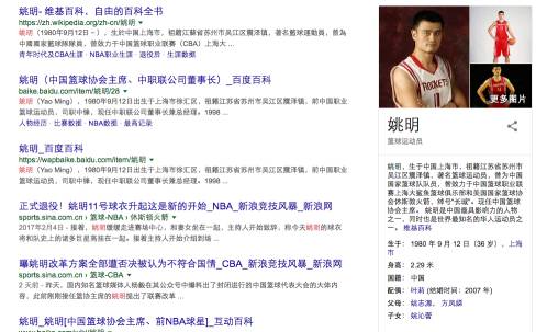 如前所述,知识图谱的活跃得益于Google的Knowledge Graph项目。Google通过构建知识图谱,将内部信息资源都唯一的关联起来。例如“姚明”是知识图谱中的一个实体,包含相关的一些属性例如出生时间、地点、身高。同时,可以将搜索引擎中所爬取的和“姚明”相关的文档和图片都与这个实体关联起来。Google的知识图谱项目中最早的应用方式就是在搜索引擎返回结果里面提供“知识卡片”。传统的搜索引擎返回界面中,通常是查询词所匹配的文档列表,如图4左面所示。然而在2012年5月16日以后的Google的搜索引擎返回结果中,如果查询词匹配了Google的知识图谱中的某个实体,Google还会以知识卡片的形式返回这个实体的一些属性和其他实体的关系。例如当我们搜索“姚明”时,Google会返回如图4右边所示的知识卡片,包括姚明的出生时间、地点、身高,以及他的妻子叶丽;甚至包括相关联的姚明的图片。