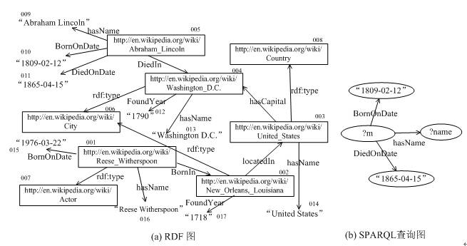 我们也可以将 RDF 和 SPARQL 分别表示成图的形式。例如在RDF中,主体和客体可以分别表示成RDF图中的节点,一条称述(即RDF三元组)可以表示成一条边,其中谓词是边的标签。SPARQL语句同样可以表示成一个查询图。 图3显示了上例所对应的RDF图和SPARQL查询图结构。回答SPARQL查询本质上就是在RDF图中找到SPARQL查询图的子图匹配的位置,这就是基于图数据库的回答SPARQL查询的理论基础。在图3例子中,由节点005,009,010和011所推导的子图就是查询图的一个匹配,根据此匹配很容易知道SPARQL的查询结果是“Abraham Lincoln”。