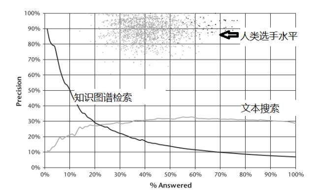 面向知识图谱的问答系统还包括Amazon收购的EVI产品。EVI的原名叫True Knowledge[29],是一家创业公司的产品。本质上就是用三元组的形式来组织数据,根据模板技术将用户的自然语言问题转化为结构化的查询语句找到结果返回给用户[29]。IBM的Watson系统中也同样采用DBpedia和Yago知识图谱数据来回答某些自然语言问题[3];相比于传统基于文档的问答方法,基于知识图谱的问答其准确度更高,但是这样方法所能回答的问题相对较少。例如图9给出了IBM的Watson系统中利用知识图谱检索可以回答的问题的覆盖面小于传统利用文本搜索的覆盖率,但是利用知识图谱进行问答其精确度要高得多。