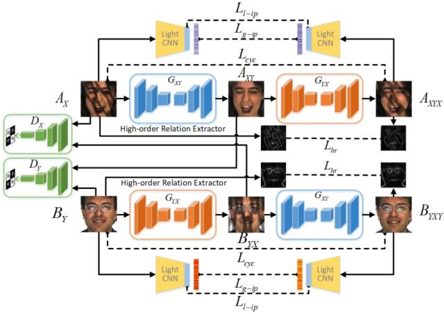 针对人脸图像保护和网纹人脸识别问题,中国科学院自动化研究所智能感知与计算研究中心近期提出了高阶关系保持的循环生成对抗网络(High-order Relation-preserving CycleGAN,HRCycleGAN)方法[4],他们将网纹人脸保护和修复问题转化为图像转换问题,以循环生成对抗网络(CycleGAN)为基础,提出了高阶关系保持损失(High-order Relation-preserving loss,HR loss)恢复更加细节的纹理;此外为了保持人脸身份信息,引入了全局和局部身份保持损失。该方法不仅能够从网纹人脸图像中恢复出清晰人脸图像;还能对输入的清晰人脸图像加入随机网纹,保护人脸图像不被随意使用,使得其它机器算法破解网纹更加困难。具体的框架图如下: