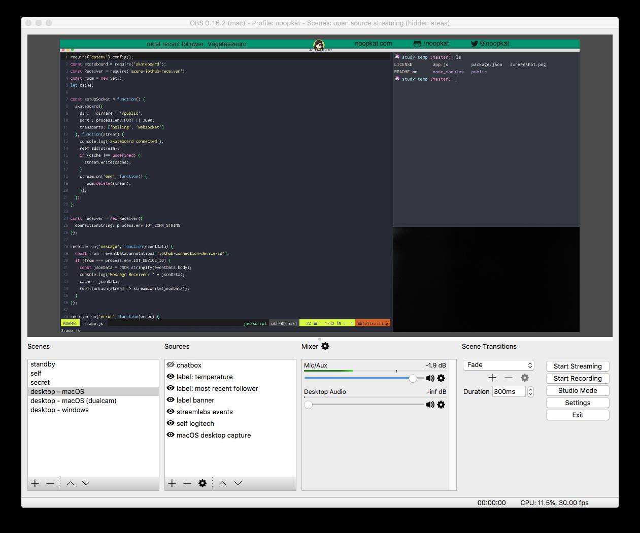 在我的场景中都有一个清晰的标签,其中的许多和顶部横幅的统计资料和信息有关。这个横幅仅仅是为了添加个人的信息,也是在直播中持续的信息源。它是我在GIMP中制作的图像,并将其作为场景从输入源中导入。一些标签是从文本文件中获取到的信息(比如最近的关注者)。另一个标签是我自己制作的标签,显示了我在直播时现场的温度和湿度。