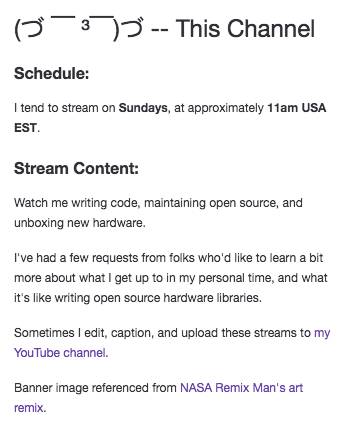 一周后,我设置好了Twitch房间信息,使用OBS工具,我准备开始直播了。我一直维护着 Avrgirl-Arduino这个库,我想我在直播的时候也做这个库的工作好了。第一次直播是很困难的,那时我很紧张,前天晚上熬夜还在不断的排练着直播时准备讲的内容。
