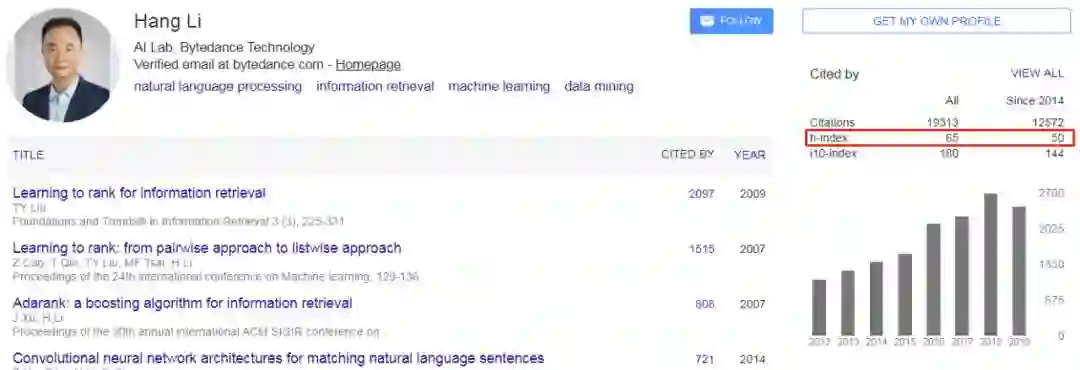 李航博士一直活跃在相关学术领域,曽出版过三部学术专著,并在顶级国际学术会议和顶级国际学术期刊上发表过上百篇学术论文,包括 SIGIR、WWW、WSDM、ACL、EMNLP、ICML、NeurIPS、SIGKDD、AAAI、IJCAI 等。他在 Google Scholar 上的
