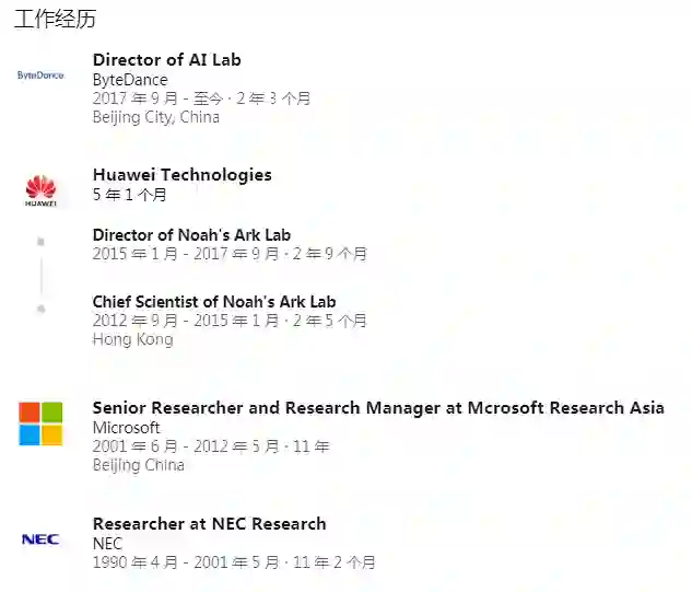 博士毕业后,他曾先后担任日本 NEC 公司中央研究所研究员、微软亚洲研究院高级研究员与主任研究员、华为诺亚方舟实验室首席科学家、主任。