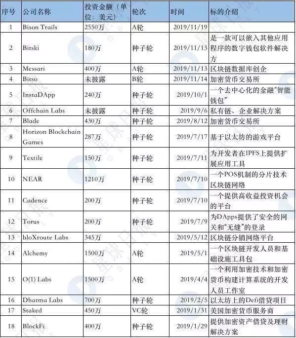 除了上述表现活跃的 10 只加密基金以外,其他加密基金总体呈现投资收缩的趋势,比如我们熟知的 Andreessen Horowitz(亦称 a16z),根据其公开披露的信息,2019 年 a16z 仅投资了包括 Compund、Arweave、Dapper Labs 和 Anchorage 在内的四家区块链和加密货币初创企业,却大大增加了在 AI人工智能和生物科学领域的投资规模。