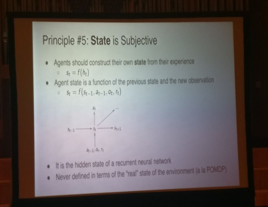 应将状态建立为模型的状态,即RNN的隐藏状态,而不是根据环境定义。只有agent对世界的主观看法才是重要的。不要推理外部现实,因为达到的效果非常有限。