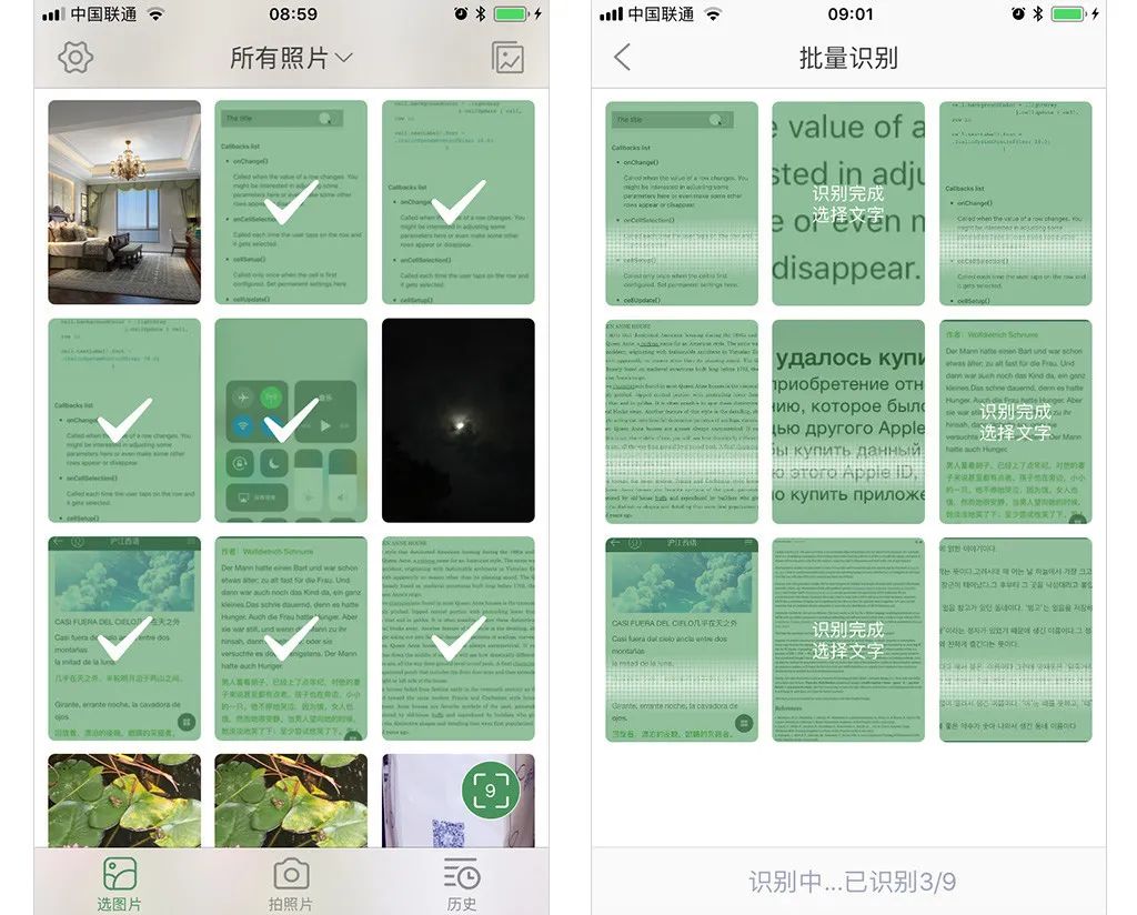 多选之后即可进入批量识别界面,如上图右图所示,在批量识别界面可以设置任何一张图片的识别语言,识别完成之后可以进入任何一张图片选择需要的文字,全部识别完成之后,最下面的大按钮会变为「合并并查看文字」,点击即可去识别结果页面查看所有文字,并对所有图片和文字进行校对。