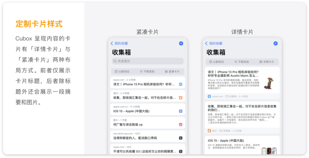 相比于用笔记工具来管理「系统化信息」的阅读,Cubox 可以让碎片信息管理变得简单:减少信息录入成本,Cubox 的解析功能甚至可以通过微信发送的链接,或者任何地方复制的链接,来直接采集内容本身;保留信息的原始属性,比如作者、原网址、文章封面图等;Cubox 还提供标注功能,可以高亮文字片段或图片,并写下相应的笔记。