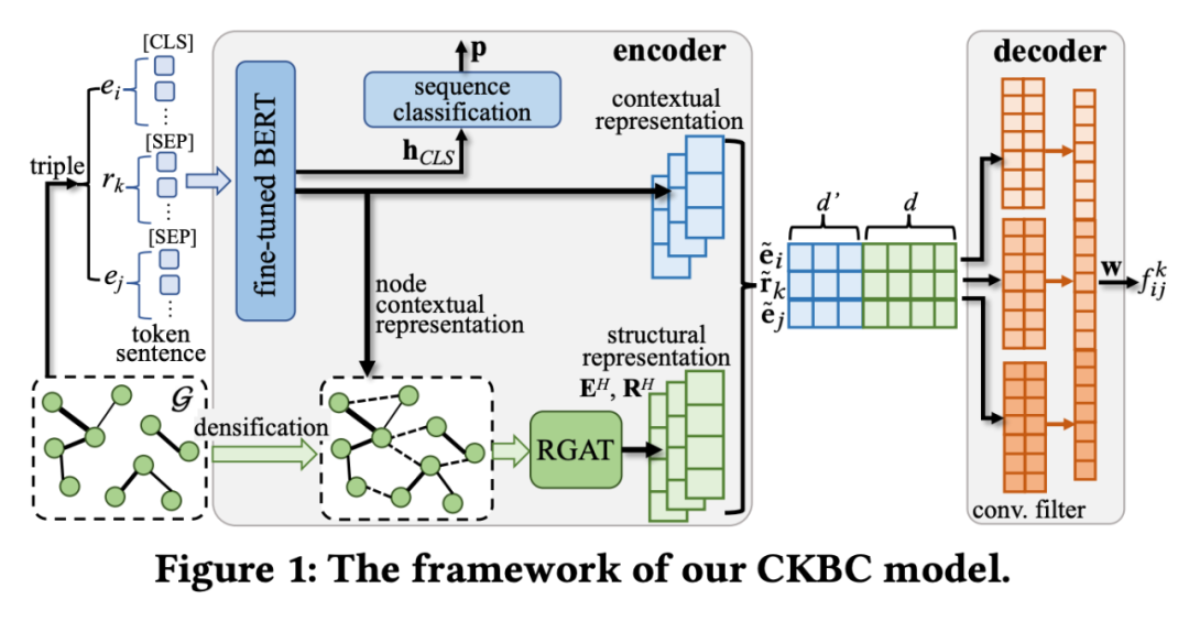 首先提出了一种关系图注意力网络的变体——RGAT,将边信息和不同邻居节点的权重编码到三元组的结构表示中。其次利用序列分类任务而不是掩码任务来微调 BERT,使得 BERT 中的外部知识能被更好地提炼为三元组的上下文表示,从而提高 CKBC 的性能。