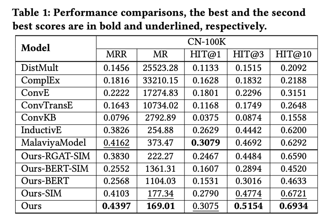 本文在 CN-100K 数据集上进行了实验,采用 MR、MRR 和 HIT@1/3/10 作为评价指标。并且我们选取 DistMult、ComplEx、ConvE、ConvTransE、ConvKB、IndectivE 以及 MalaviyaModel 作为 baseline 模型。为了做消融实验,使用 -BERT 和 -RGAT 分别表示没有上下文表示和没有结构表示的模型变体,-SIM 表示没有图致密化的模型变体。具体结果如下表所示:
