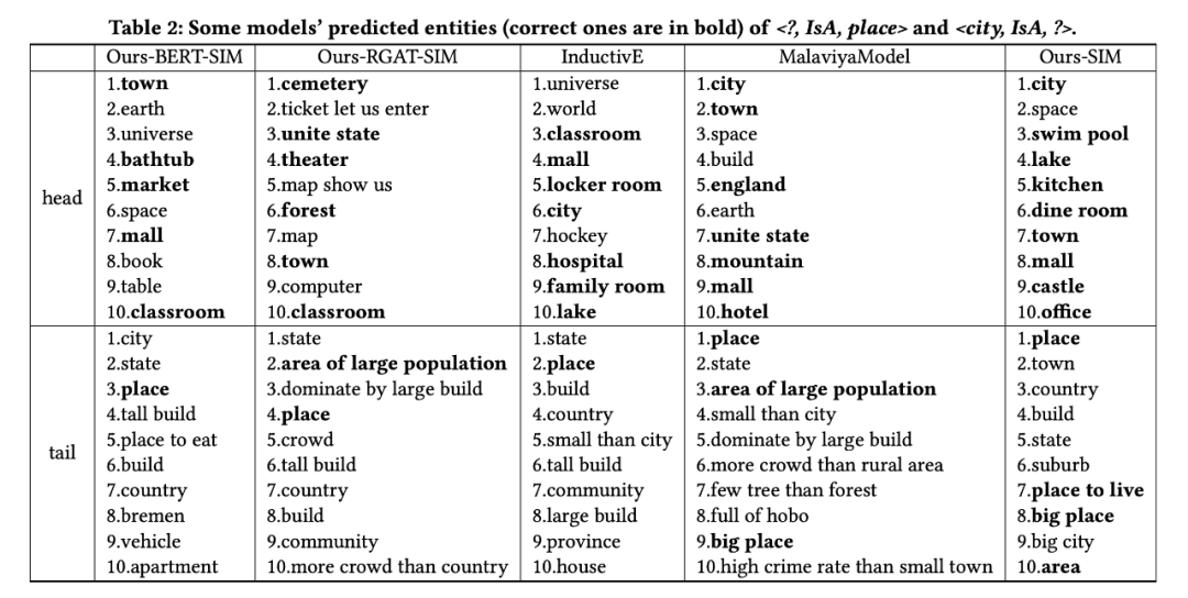 本文分别替换了 <city, IsA, place> 中的头实体和尾实体,然后获得以下五个模型排名前十的预测结果。