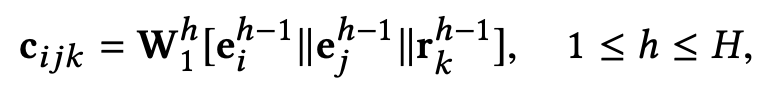 ,该三元组在第 h 层中的向量表示通过下面的线性变换得到:
