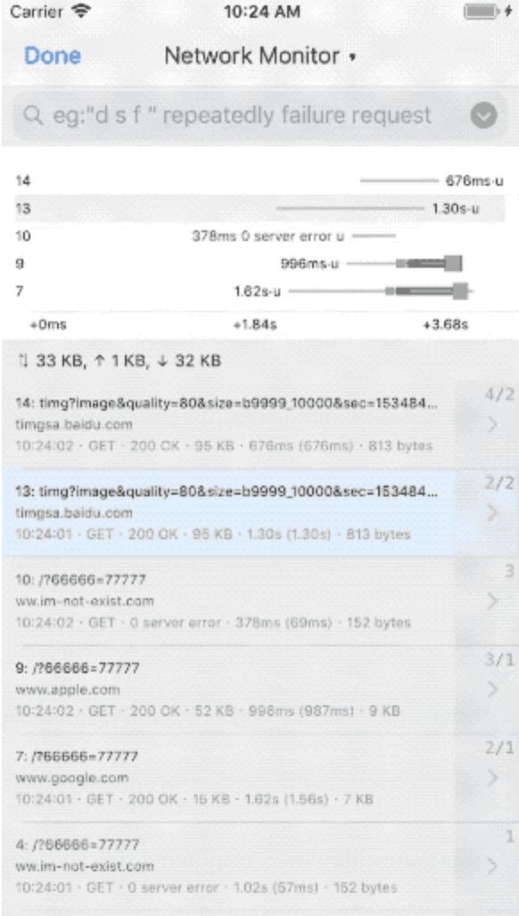NetworkMonitor 监听记录 App 内 HTTP(S) 网络请求的各个阶段耗时,并提供内置的记录查看界面,便于开发者排查优化网络问题。