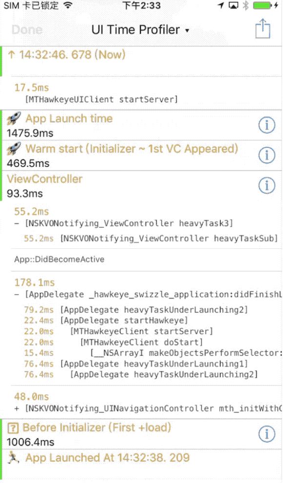 UITimeProfiler 用于辅助主线程耗时任务的优化。内部分成了 VC Life Trace 和 ObjC CallTrace 两部分。VC Life Trace 用于跟踪打开 ViewController 各个阶段的具体时间点,ObjC CallTrace在开启后,则可跟踪耗时大于指定阈值的 Objective-C 方法,类同于 Instrument 的 Time Profiler 功能。