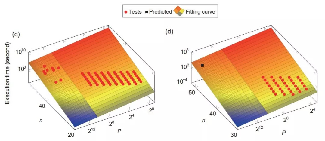图 2:可扩展性。(a)和(b)展示了用 P 个节点来计算一个 n x n 矩阵的积和式的执行时间。「@CPU」表示仅在 CPU 上运行获得的结果,「@Hybrid」表示在 CPU 和加速器异构并行执行获得的结果。拟合曲线的斜率表明 n 每增加 1,执行时间增长约 1.95 倍,而计算节点每加倍,执行时间减少约 0.52-0.56 的比例。(c)是 Ryser 算法用 P 个节点来计算 n x n 矩阵的积和式的执行时间。校正 R 平方统计系数是 0.9996,表明拟合结果良好。(d)是 BB/FG 算法的拟合执行时间。黑点是使用天河二号全系统来计算 50x50 矩阵的积和式的预测时间。