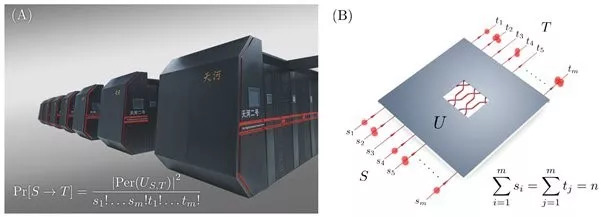 图 1:实现玻色采样的计算任务:(a)天河二号超级计算机计算积和式;(b)光量子系统通过采样输出光子直接完成玻色采样。