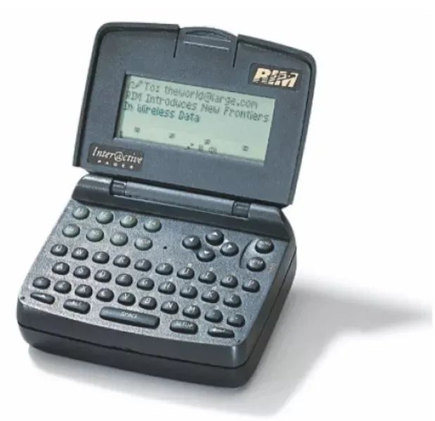 这就不得不说到黑莓的起源。黑莓创立于 1984 年,最初的名字是 RIM(Research In Motion,行动研究)。RIM 早期的主力产品是寻呼机和调制解调器,1996 年推出首款双向寻呼机 Inter @ ctive Pager,即 RIM 900,配备 QWEERTY 全键盘,开始进军商务市场,为未来的黑莓手机写入了全键盘的 DNA。