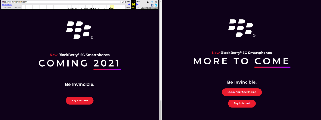 可是,黑莓手机确实没在活着。因为整个 2021 年,OnwardMobility 承诺的黑莓手机都没有到来。这家公司所做的,只不过是在 2022 年到来之后,默默换掉了“黑莓手机 2021 年发布”的官网海报,然后发布了一篇博文表示自己“还没死”。